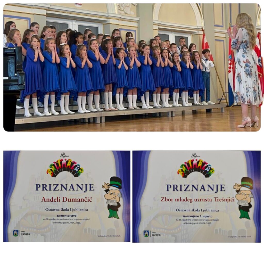 Na Smotri zborova i glazbenog stvaralaštva Grada Zagreba, održanoj 8. travnja u Osnovnoj školi Zapruđe, naš zbor Trešnjići, pod vodstvom voditeljice Anđele Dumančić, ostvario je izvanredan uspjeh te je pozvan na državno natjecanje koje će se održati u Varaždinu 6. ili 7. svibnja 2026. godine.