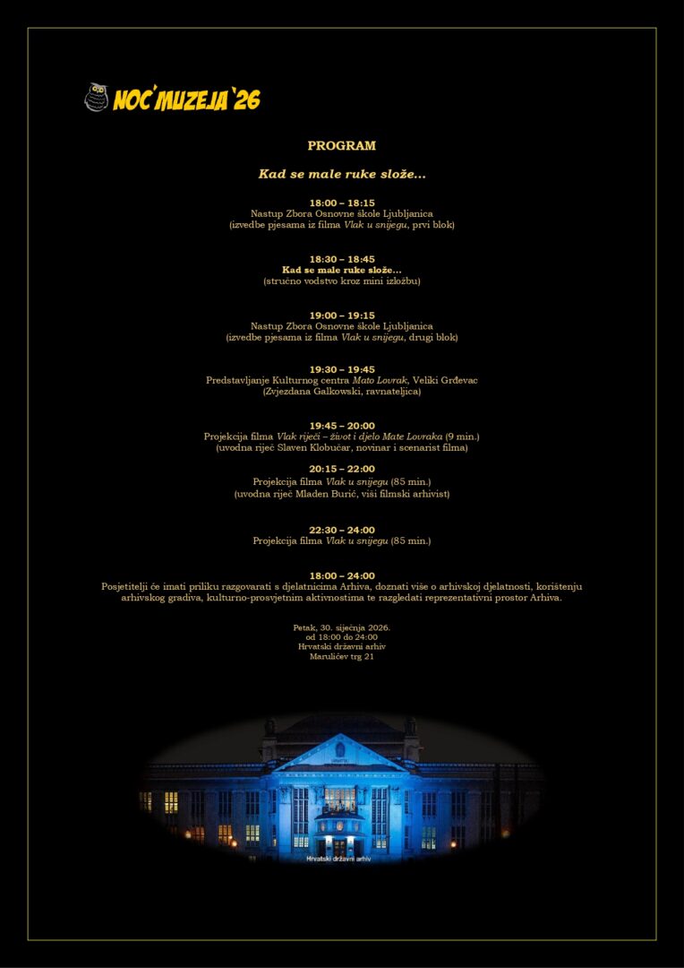 Hrvatski državni arhiv ovogodišnju je Noć muzeja posvetio 50. obljetnici filma ‘Vlak u snijegu’ nastalog na temelju istoimenog romana pisca dječjih romana Mate Lovraka. S ponosom objavljujemo da će u Noći muzeja u Hrvatskom državnom arhivu nastupiti naši Trešnjići koji će izvesti neke od najpoznatijih pjesama iz filma! Dođite i podržite naše Trešnjiće!